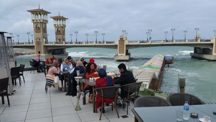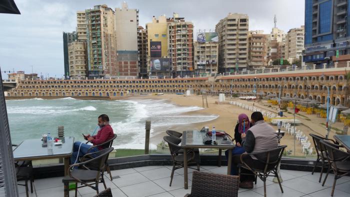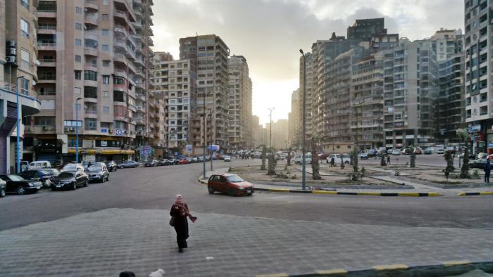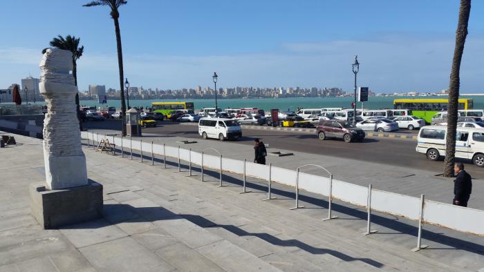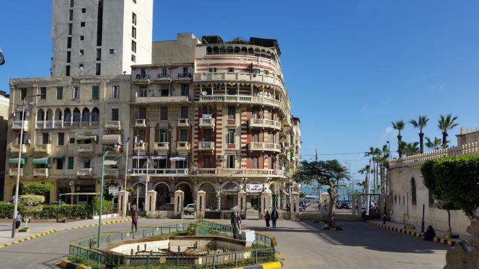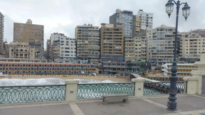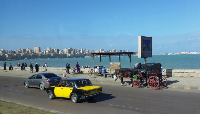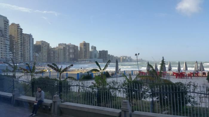 Высотные дома в Александрии стоят сплошной стеной прямо вдоль набережной. Магистраль, проходящая рядом с домами, все время делает повороты, и каждый раз открывается очень красивый вид на город и берег моря. Берег везде пологий и песчаный, летом люди купаются на протяжении всего побережья, специальных пляжей нет. Кстати, в Александрии обычно отдыхают сами египтяне, город считается дорогим курортом.