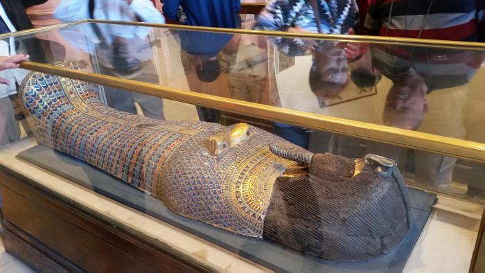 Фотографировать в каирском музее категорически запрещено, фотоаппараты и видеокамеры проверяются и отбираются на входе. Впрочем, поснимать все же можно, если сразу заплатишь определенную сумму. Но, как выяснилось чуть позже — в зале, где находятся предметы из гробницы Тутанхамона, делать фотоснимки нельзя вообще ни при каких обстоятельствах. Смотритель, стоящий прямо посреди зала, возле золотой маски Тутанхамона, громким и грозным голосом (близким к крику) пресекал любые попытки что-либо отснять. Хотя, скажу по секрету, я видел, как туристы из нашей группы, прикрываясь спинами, ухитрялись все же отщелкать по паре фоток на свои смартфоны (которые проносить можно). Такой уж у нас народ.