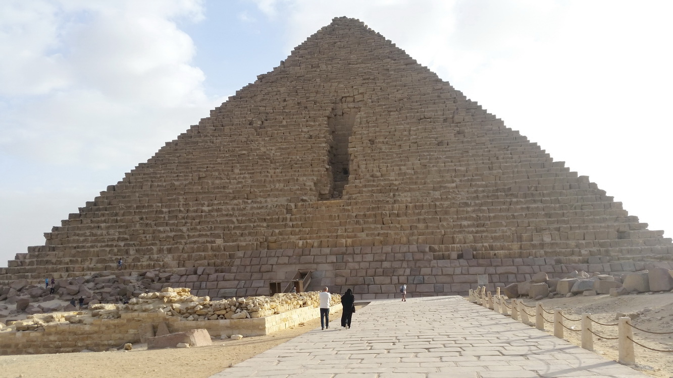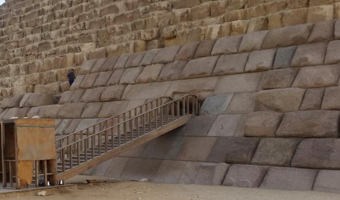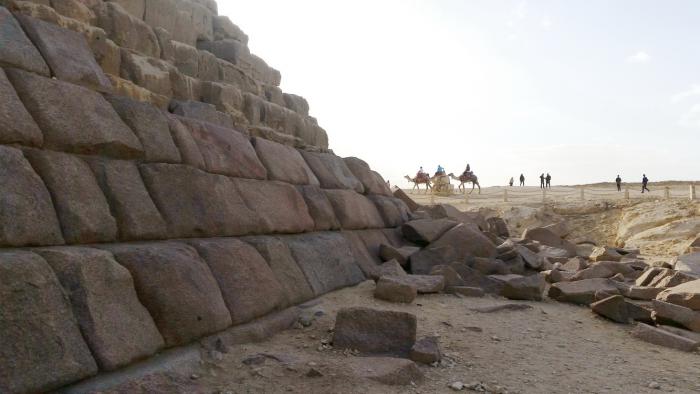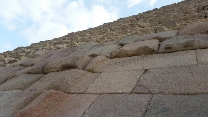 На примере пирамиды Микерина (другое известное название — пирамида Менкаура) очень хорошо видно, что древние строители использовали абсолютно другую логику строительства, радикально отличающуюся от современной. Если внимательно присмотреться к сохранившейся здесь гранитной облицовке, можно понять, как собиралась пирамида и как она облицовывалась. Например, можно заметить, что облицовку самого нижнего яруса как бы ставили рядом с пирамидой. Причем не столько для красоты или защиты от внешнего воздействия, как сделали бы мы — тут она несет именно функцию силового элемента. Хорошо заметно, что внутренние камни из известняка обтесывались и опускались в щель между отдельно стоящей облицовкой и основным телом пирамиды. Здесь именно другая логика строительства: не прочный каркас внутри, а внешний силовой кожух.