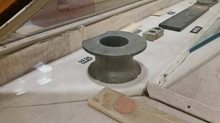 Тем не менее – вот оно! Под стеклом лежал выполненный из камня потрясающий древний «шкив» непонятного предназначения, который НИ ПРИ КАКИХ УСЛОВИЯХ невозможно сделать «вручную», используя лишь примитивные инструменты. Идеальное по окружности отверстие в центре подсказывает вариант использования какого-то станка наподобие токарного, но способного «вгрызаться» в твердую породу, не оставляя никаких сколов и рисок. Не ясно, каким образом можно было сразу получать с помощью сверлильного инструмента совершенно ровную обработанную поверхность — при ручной обработке добиться этого невозможно в принципе!