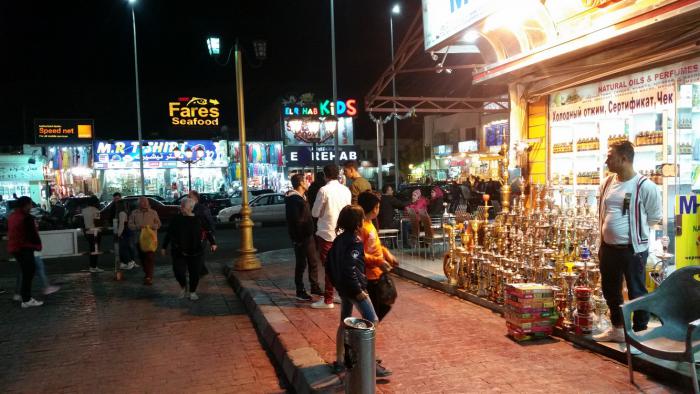 Справедливости ради нужно отметить, что впечатление от Шарм-эль-Шейха очень сильно меняется, когда ты вечером попадаешь на главную магистральную улицу города — проспект Peace Road, соединяющий раскинувшийся вдоль берега моря город в единое целое. Тут начинаешь понимать, что это все-таки курорт вполне европейского уровня, испытывающий лишь временные трудности. Центр Старого города оживлен в любое время суток, но по вечерам в особенности. Здесь по-настоящему попадаешь в атмосферу города из восточной сказки. Причем людей на улицах с каждой минутой становится все больше. Что, в общем-то, не удивительно. Ведь на побережье Шарм-эль-Шейха расположено множество отелей, пляжей и мест отдыха туристов со всего мира. В городе до недавнего времени действовало более 200 отелей разного класса и ценовой категории, большинство из них и сейчас остались на плаву.