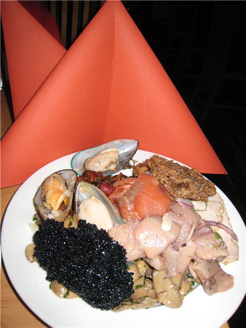 «Но мы на борту пошли в кафе Sea Side (на 7 палубе) и великолепно поужинали на двоих за 25 евро (с пивом). Там система такая – любое горячее и салаты стоят по 1,9 евро за 100 г. Набираешь всего, что тебе нужно на тарелку, а потом ее взвешивают. Пиво – 4 евро 0,5 л, сок- 2,5 евро 0,5 л, хлеб 30 центов, пирожное 2,5 евро. В общем, если не хочешь обжираться от пуза, смысла покупать ужин нет.»