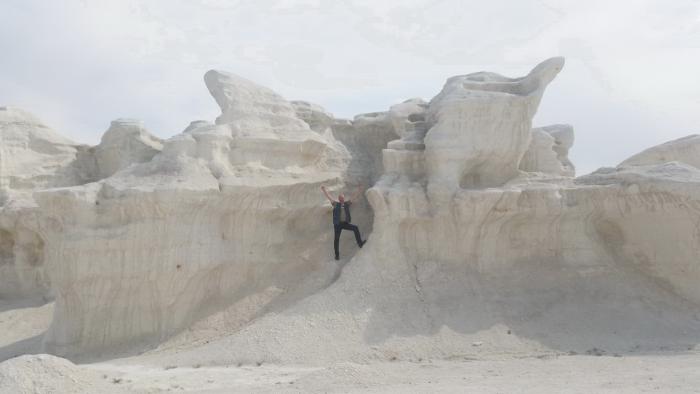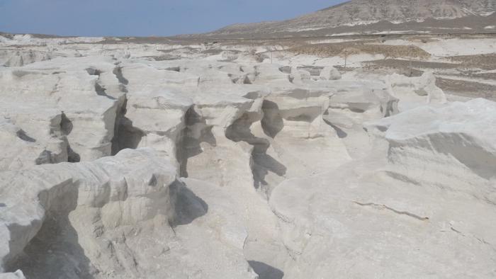 Полюбовавшись просторами Мангышлака со смотровой площадки у мемориала, пустились в дальнейший путь. Надирхан предложил заглянуть в горную долину с меловыми останцами, которая относится к числу местных достопримечательностей. И часа через полтора, посетив по пути заправку, мы въехали в сказочной красоты ущелье, образовавшееся в результате действия природных стихий. До самых высоких гор в долине (некоторые из них достигают 150-170 метров и очень популярны у любителей скалолазания) мы не добрались в связи с недостатком времени. Но и того, что удалось увидеть, достаточно для общей «картинки», которая навсегда отложилась в памяти и будет связана именно с землей Мангистау. Тут ко всем прочим запоминающимся пейзажам добавился отдельный яркий «пазл», с конкретным ощущением пребывания на какой-то другой планете. Эрозионные процессы и выветривание пластов мела привели к созданию невероятно причудливых форм, среди которых можно запросто потеряться во времени и пространстве. Причем в совершенно буквальном смысле – углубившись в меловое ущелье, достаточно быстро можно потерять ориентацию и уйти не в ту сторону. Наверняка здесь отличное место для занятий медитацией.