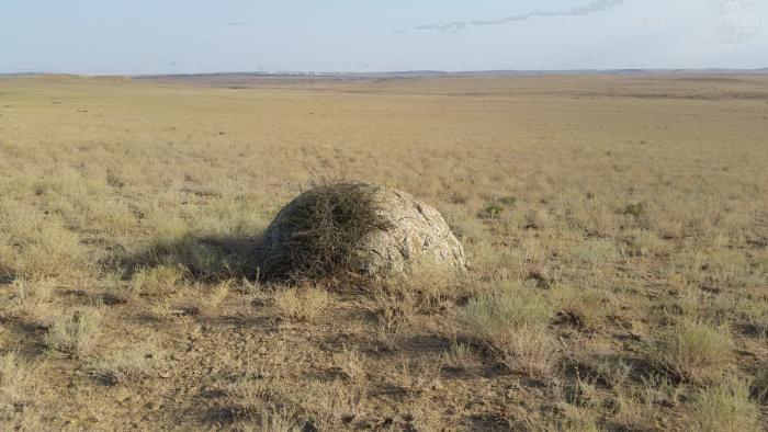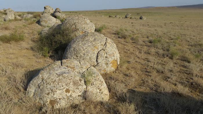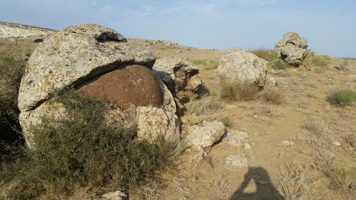 Километрах в десяти за Шетпе в сторону Жынгылды вдоль трассы начинают попадаться странные шаровые каменные образования. Пока еще в единичных экземплярах. Но к вечеру мы доберемся и до целых полей, где эти шары представлены в разных размерах и разновидностях.