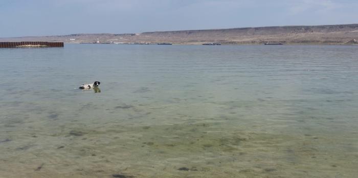 В Баутино (портовый поселок, который находится рядом с городом Форт Шевченко) я видел, как разомлевшая от жары крупная черно-белая собака стоит по горло в воде Тюб-Караганского залива. Когда я приблизился к ней по прибрежному песку, чтобы выбрать более удачный по отношению к солнцу ракурс для съемки — она нехотя выбралась из воды. Стоило мне удалиться – купание тут же продолжилось на том же самом месте.