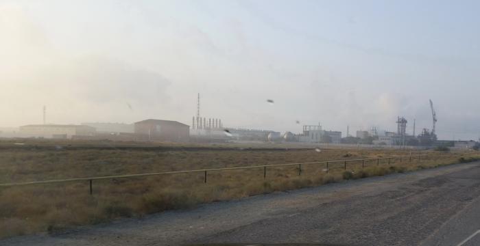 Третий день нашего пребывания в Актау начался рано-рано утром. Надирхан, как договаривались, подъехал к нам на своей машине, и мы отправились в автопутешествие по Мангышлаку. Первым делом наш водитель показал южную, промышленную часть города. Актау теперь преимущественно развивается в направлении на север вдоль Каспийского моря. Юг же лично на меня особого впечатления, признаться, не произвел. Практически все то же самое можно увидеть в производственной зоне нашего Павлодара. Те же серые громадины промышленных гигантов, только с другими, местными названиями. Те же крепко побитые тяжелым транспортом дороги. И крайне невзрачный, даже откровенно унылый пейзаж. Еще и основательно размазанный туманом, который опустился на город именно в это раннее утро…