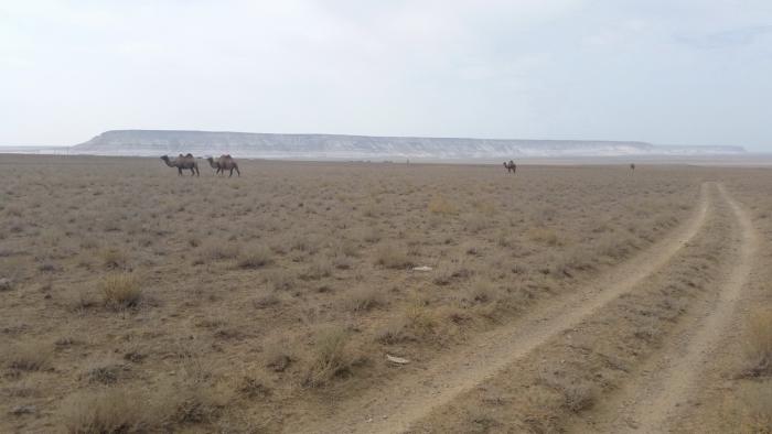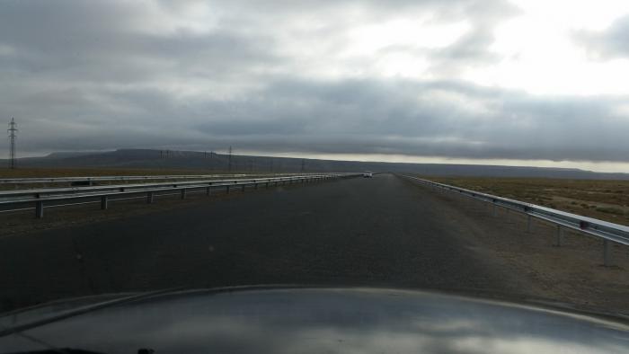 Впереди нас ждал спуск в знаменитую впадину Карагие, которая является самой глубокой сухой впадиной в Казахстане и одной из наиболее глубоких в Азии: 132 метра ниже уровня моря. Длина впадины составляет 85 км, ширина — до 25 км. И вот тут, спускаясь вниз по новой, только что заасфальтированной дороге, мы вдруг выскочили из белесой пелены тумана в область отличной видимости. Теперь туман, в котором машина двигалась последние двадцать минут, оказался сплошным покрывалом низкой и тяжелой облачности, нависшей над нашими головами. Все боковые стороны этого огромного покрывала, такое впечатление, просто лежали на краях впадины и плотно накрывали ее сверху как гигантскую сковородку. Такого низкого «неба» я не видел никогда в своей жизни.