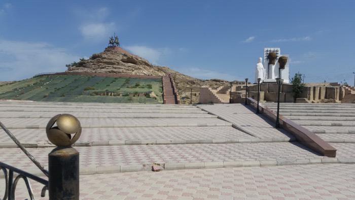 Между прочим, в Актау я слышал мнение, что в Форте «нечего смотреть». Могу однозначно сказать, что это не так. Городок, на мой взгляд, весьма самобытный и интересный. Над всей окружающей местностью здесь довлеет каменная вершина Курган-Таса, увенчанная скульптурами местных батыров. Это Иса Тленбаев и Досан Тажиев, предводители адайского восстания 1870 года. Тогда вышло так, что с одной стороны русские были как бы освободителями казахов от власти Хивы. А с другой — адайцы ведь бежали в эту пустыню за вольной волей, а не за тем, чтобы им «закручивали гайки», как получилось впоследствии. Восстание подавили, но местная администрация испугалась настолько сильно, что на несколько лет, до 1874 года, Мангышлакское приставство (ещё не уезд) передали Дагестанской области с губернской властью по ту сторону Каспия.