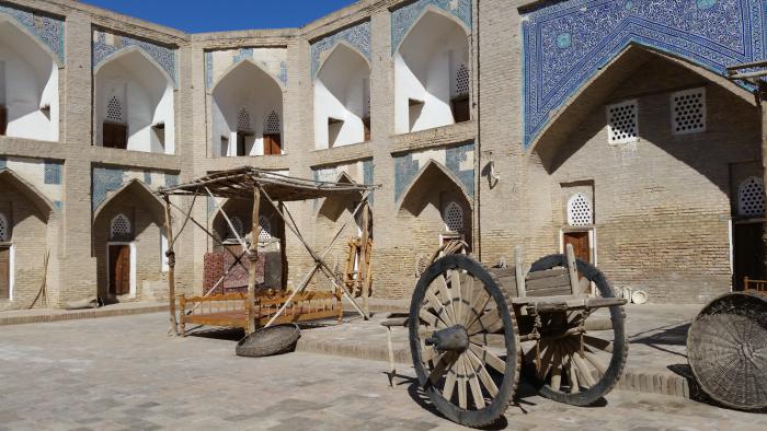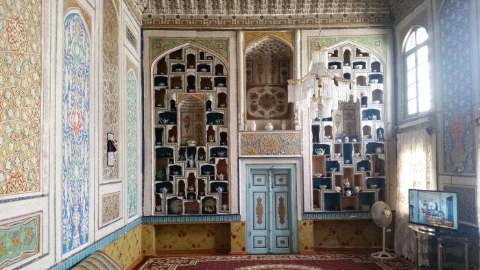Совершенно невыразительны с точки зрения внешнего вида и «присутственные места» — хакимияты. В массе своей они представляют собой двух-трехэтажные здания без всяких архитектурных излишеств. Вообще узбекский народ отличается в этом смысле удивительной скромностью. За внешним крайне непритязательным фасадом может скрываться достаточно богатое убранство внутренних помещений, что нам и продемонстрировала свадьба в Самарканде, на которую мы случайно попали. Еще более впечатляющей оказалась так называемая «летняя» комната в Бухаре, которую нам порекомендовала обязательно увидеть хозяйка хостела «Rumi» Хуршида. Дом, в который мы в результате попали, построен около 150 лет назад (но в нем абсолютно не чувствуется запаха затхлости, свойственного очень старым жилым помещениям). И сегодня это просто жилой дом, мимо которого в старом городе можно пройти, даже не подозревая, что скрывается за высокими глинобитными стенами. Гостиная, которую удалось увидеть, по своему интерьеру вполне может претендовать на «эрмитажную» экспозицию. Как нам поведали гостеприимные хозяева, подобных больших комнат с уникальным оформлением в полумиллионной Бухаре сохранилось меньше десятка.