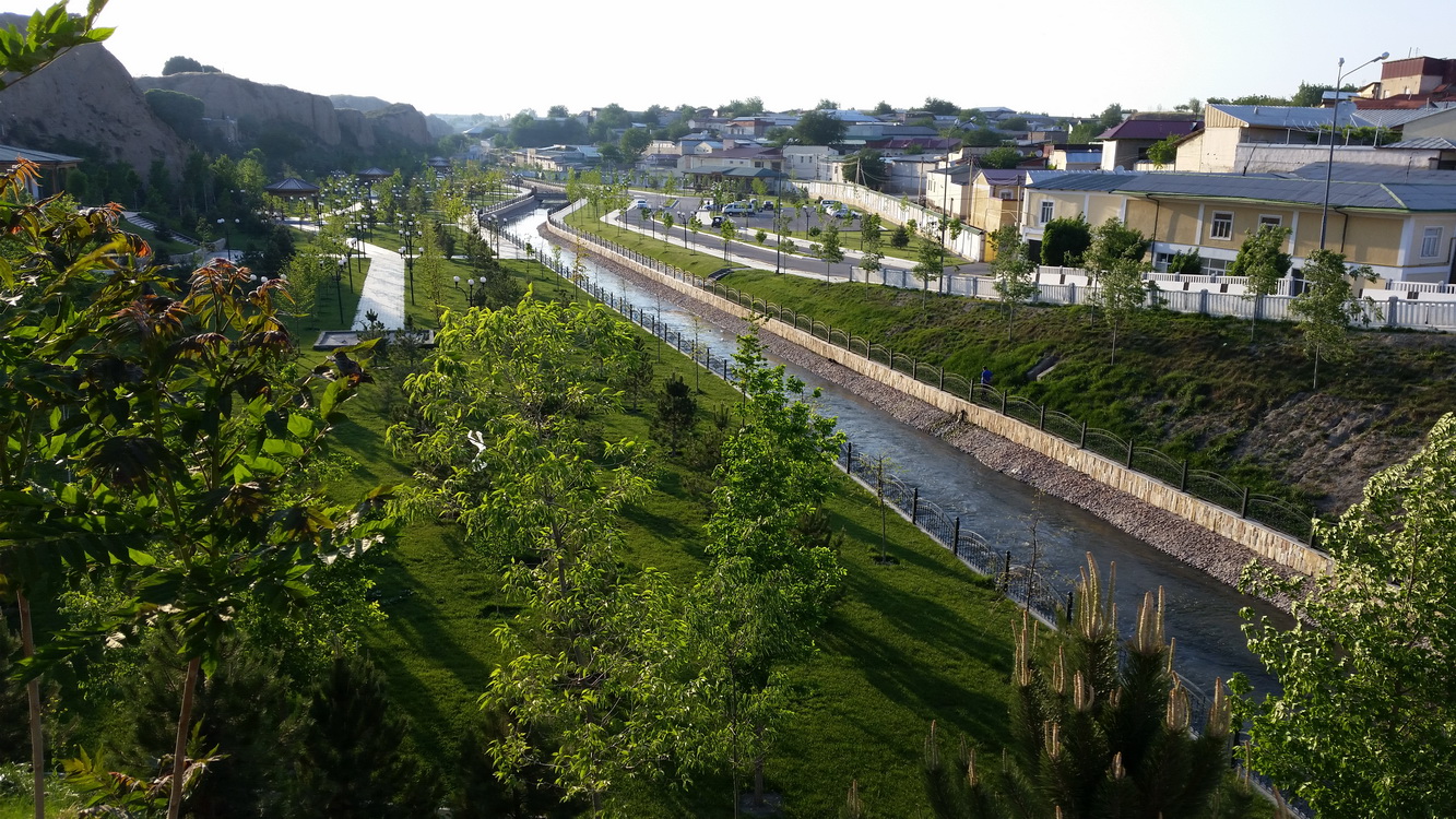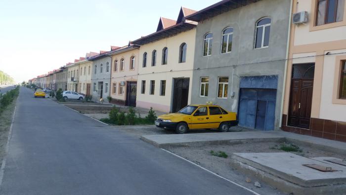 Кстати, проспект этот — прямой как стрела — идущий от самого вокзала, отличается несколько необычной, «питерской» застройкой. С обеих сторон здесь располагается ряд двухэтажных домов, построенных вплотную друг к другу, стена к стене. Собственно, немалая часть их еще находится в процессе строительства. Как нам рассказали, руководство города еще во времена И.Каримова поставило перед живущими здесь горожанами конкретное условие: либо ты сам возводишь на своей земле двухэтажный дом в едином утвержденном стиле, либо (если подобное деяние не по силам) продавай участок тому, кто сможет это сделать. Данную информацию не проверял, но нестандартный облик главного проспекта, по которому въезжаешь в город с железнодорожного вокзала, налицо. Понятное дело, не всем под силу одолеть такое строительство — хотя некоторые и влезли в неподъемные кредиты. Поэтому, наверное, здесь много недостроенных домов с вывеской «Продается»…