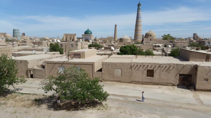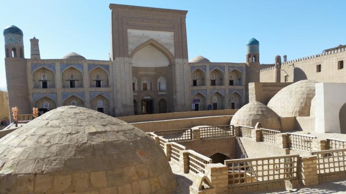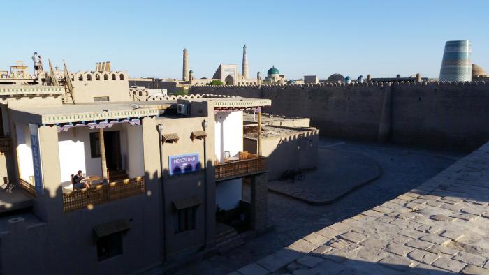 С крыши отеля обозревается, по сути, вся древняя Хива. И вид этот завораживает. Перед взором предстает город из восточной сказки. Небо пронзает вереница минаретов, над плоскими крышами домов возвышаются купола мавзолеев и мечетей, сверкающие голубыми изразцами пештаки (порталы) средневековых медресе вздымаются над галереями затененных лоджий, зубчатые стены крепостных стен перемежаются с монументальными порталами городских ворот. Среди лабиринтов улочек выделяются ханские дворцы, окружающие дворики с нарядными айванами (в исламской архитектуре «айван» обозначает сводчатое помещение, с трех сторон обнесённое стеной и открытое с четвёртой стороны).
