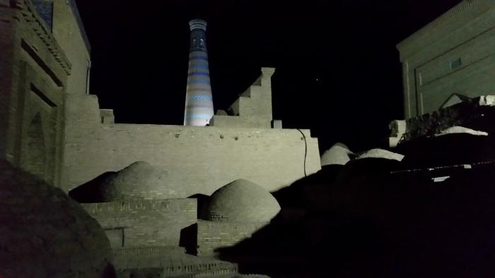 На крышу отеля (как, заметил, и многих других в старом городе) можно свободно подняться и пофотографировать. Хива в этом смысле вообще отличается удивительной «свободой нравов» для туристов. Никто и нигде тебя не одергивает, не окрикивает, не тормозит. Ходи где хочешь, снимай что заблагорассудится. За исключением, конечно, тех мест, где необходимо заплатить за проход – такие, естественно, тоже имеются. И как-то сразу вспомнился мне дворец Монплезир в Петергофе под Санкт-Петербургом – где немедленно и очень жестко пресекается любая попытка что-то отснять на фото или видео. Причем чуть позже очень дорогие фотоальбомы с теми же самыми внутренними интерьерами дворца можно прикупить у гидов в экскурсионном автобусе.