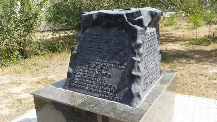 Литой на имперском Воткинском заводе, постамент имеет на себе надпись: «Старшие чины Мангышлакского экспедиционного отряда, участвовавшие в Хивинском походе 1873 года…», и далее перечислены имена 22 участников.