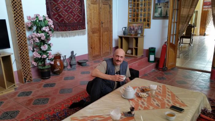 …Наше кратковременное пристанище в Бухаре, под вывеской «Rumi», позиционирует себя как «хостел и мини-отель». Это семейное предприятие, которое содержит таджико-иранская семья, люди чрезвычайно гостеприимные и коммуникабельные. Признаться, с трудом представляю, как можно выдерживать постоянный, ежедневный поток разноязычных гостей со всех концов света. Со всеми находить общий язык, всем помогать с устройством ночлега, учитывая разные вкусы и предпочтения. За одним столом на общей кухне мы одномоментно оказываемся с немцем-автотуристом Фабианом, японкой Оякой из Хиросимы и жизнерадостным молодым парнем Искандером из Туниса. Чуть позже подтягиваются француз и американец, за ними женщина из Италии. Английский здесь – язык интернационального общения. Но в Бухаре, нужно отметить, русский язык тоже является общеупотребительным. Им на хорошем уровне владели все встреченные нами горожане.