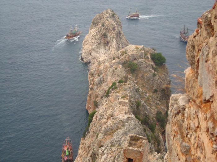 Это тонкий длинный скалистый выступ, уходящий от юго-западной части Аланийского полуострова на 400 м в море. С открытой площадки близ сельджукской башни, расположенной на части мыса, можно по дороге спуститься до самой конечной точки мыса. Здесь есть ступеньки, выбитые в скале. Однако ступеньки основательно разрушены, и пройти по ним достаточно трудно. На мысе Джильварда имеется группа монастырей, представляющих собой значительные образцы древней архитектуры. Это теория. А вот практика — кое-как нашел место, где находится этот спуск, причем пришлось идти через мусульманское кладбище. А вход оказался закрыт: