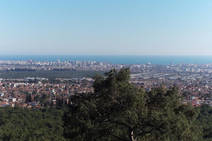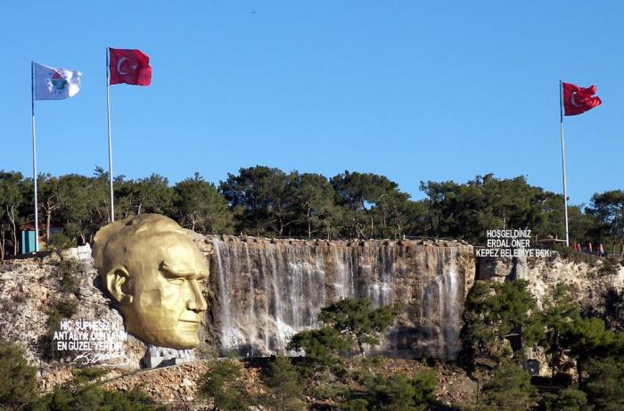 Справа от дороги простирается муниципальный парк Kepez Belediyesi Kent Ormanı с его огромным памятником Ататюрку и водопадом: