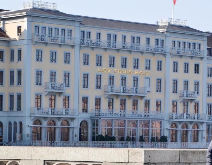 Немного вдали старинный отель «Три короля», на службе находится автомобиль Бентли с номером BS 8. Обычно в Швейцарии номера пятизначные или шестизначные.