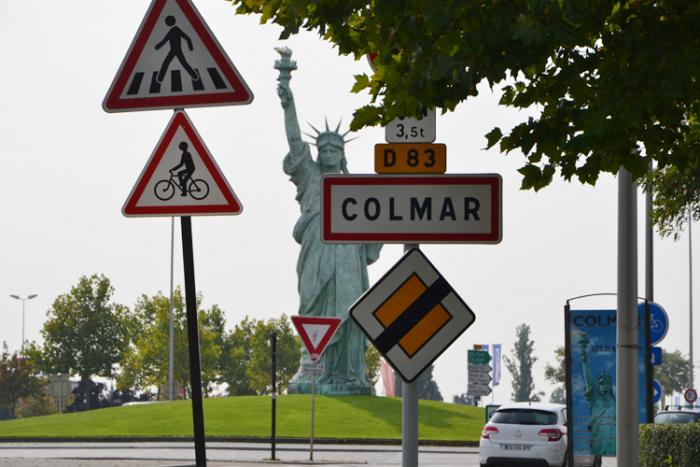 Эту фотография сделана во время посещения г. Кольмар (находится между Страстургом и Базелем). Кто планирует маршрут примерной поездки, то лучше съехать с французского автобана 35 на съезде №24 на федеральную дорогу. При въезде с севера в Кольмар стоит на круговой статуя Свободы.
