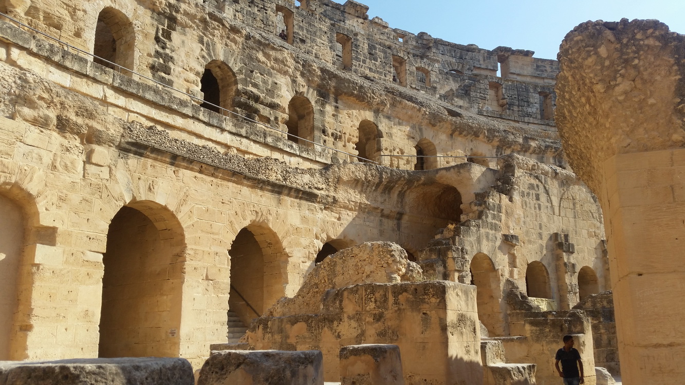 Ну, и своего рода апофеоз по части извлечения прибыли из местных достопримечательностей (по крайней мере, в этой части страны) — амфитеатр в городе Эль-Джем. Этот город в Тунисе, расположенный в вилайете Махдия, находится на месте античного города Тиздр и знаменит в первую очередь амфитеатром вместительностью до 35 тысяч человек. Между прочим, четвёртым по величине в Римской империи, после Колизея и амфитеатров Капуи и Вероны. Его, кстати, часто и сравнивают с римским Колизеем, откуда его второе название в некоторых тунисских путеводителях – Колизей, иногда с уточнением «африканский». Однако это не совсем верно, ибо подлинный Колизей, естественно, принадлежит только Риму.