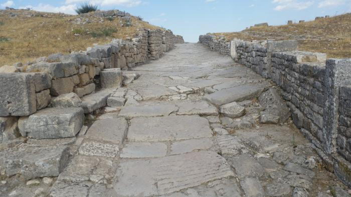 Дуггу, как ни странно, подобная участь миновала. Здешние руины производят целостное впечатление античного поселения. На значительной территории можно посмотреть неплохо сохранившуюся городскую инфраструктуру. Вплоть до мельчайших деталей: на вымощенных дорогах сохранились даже специальные насечки на камнях, чтобы не скользили колеса, а канализационная система при необходимости может функционировать и в наше время.