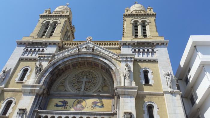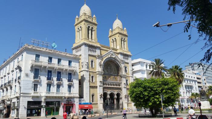 На улицах могут соседствовать мусульманские мечети, христианские храмы и иудейские синагоги. Издалека притягивает взор великолепный кафедральный собор Сент-Винсент-де-Поль — самое крупное здание колониального периода, сохранившееся в Тунисе. Находится он на перекрестке авеню Хабиба Бургибы (первый президент страны с 1957 по 1987 год) и авеню де Франс, неподалеку от корпусов Тунисского университета. Святой, в честь которого воздвигнуто это грандиозное сооружение, в католическом мире слывет покровителем благотворительности.