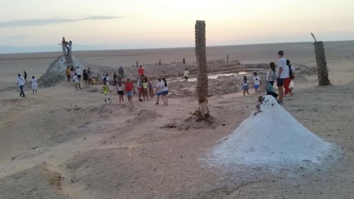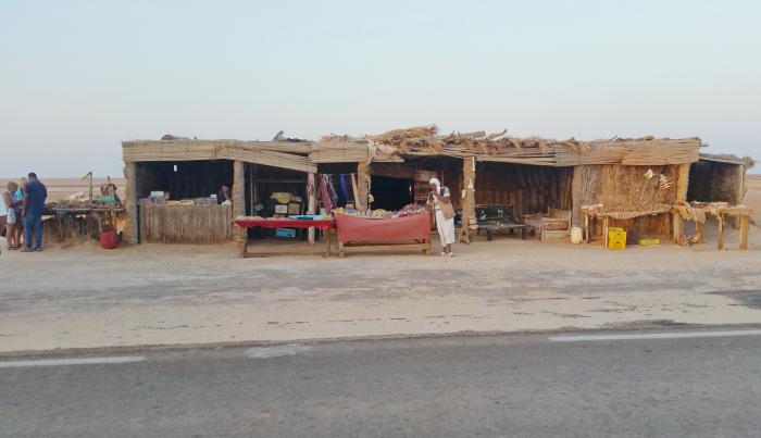 Несмотря на столь раннее утро, вдоль асфальтированной трассы, проходящей прямо по озеру, уже немало торговцев всякой всячиной: от фиников и «роз пустыни» (природных кальцитовых образований, напоминающих цветок розы) до разного рода сувениров и прочих безделушек. Торговля не дремлет!