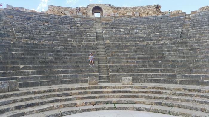 Амфитеатр в городе небольшой, рассчитан примерно на три с половиной тысячи зрителей, но тоже неплохо сохранившийся. Он, быть может, выглядит не так эффектно, как амфитеатр в Эль-Джеме (о котором речь впереди), но интерес у посетителей вызывает немалый.