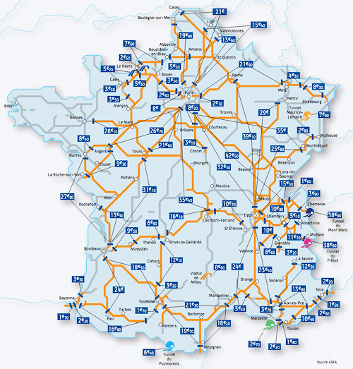 Почти все автобаны во Франции платные, для легкового автомобиля проезд стоит 5 Евро за 100 км.Платные автодороги Франции являются самыми дорогими.