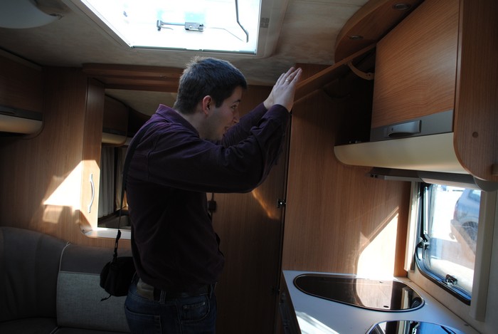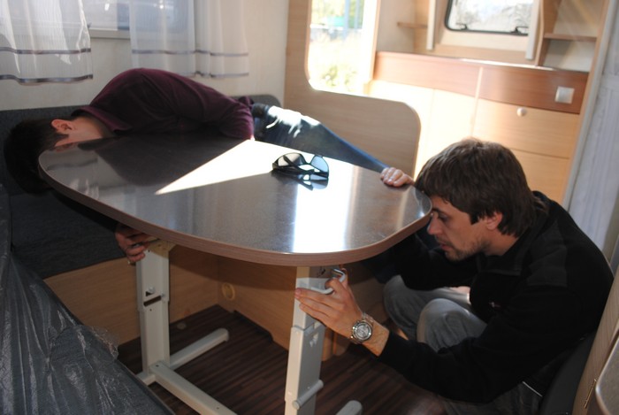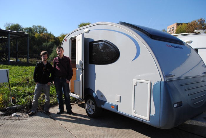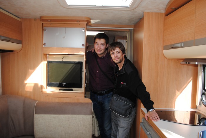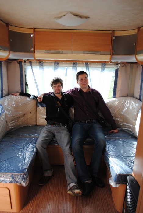 Наигравшись с выставочными образцами, мы отправились смотреть обжитые дома, где и познакомились с некоторыми караванерами. Антон сразу положил глаз на один семиметровый прицеп, который его владелец из Беларуси с удовольствием нам показал. Прицеп оказался 2000 года выпуска – но как же хорошо он выглядел! Мебель вся – как новая. Знакомство оказалось очень полезным – владелец работает в фирме по продаже б/у прицепов, и такой же прицеп как у него, оказывается, можно приобрести всего за 350 тысяч. После озвученной цены мы сразу загорелись идеей покупки подобного домика, и засыпали нашего нового друга вопросами.