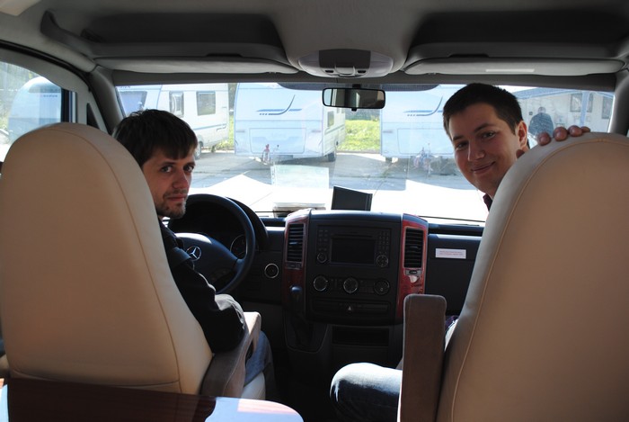 Мы с Антоном в кабине «Поляриса». Автодом Adria, сделаный на базе Mersedes Sprinter.