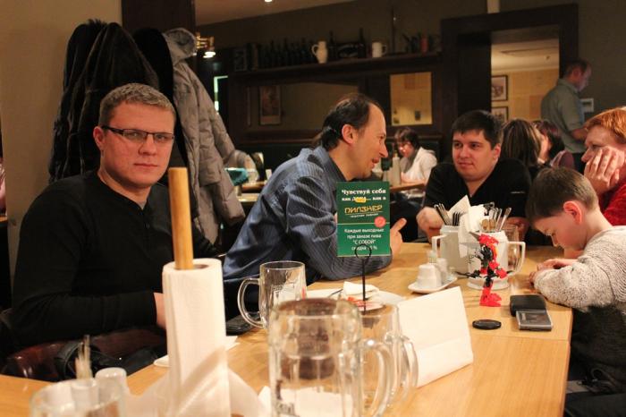 Тем временем, к нам всё прибывало и прибывало. Позволю себе не пытаться восстанавливать хронологический порядок тогда происходящего, благо уже успели мы с Анной, Марией и Лёшей заказать пиво и расслабиться после трудового дня. Да и кому, в прочем, эта хронология интересна?.. Пришёл mwnuke (Сергей), уже знакомый большинству по его невероятному автопутешествию на Ладе Калина по Европе пару лет назад, в копилке которого, между прочим, прибавилось и ещё. -)