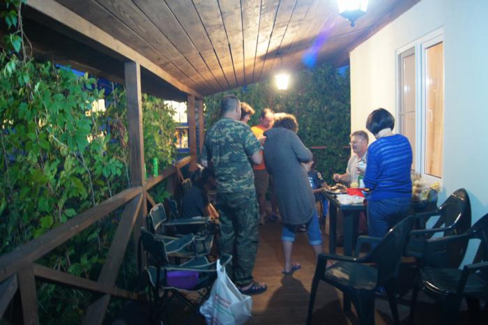 Переместились все в домик №8, где базировались Tat77's с Тёмой и Димой, Олеg и Люба, Гоша и Аня. Уютная верандочка, богатый стол, борьба с бутылкой вина… )))