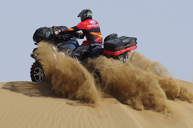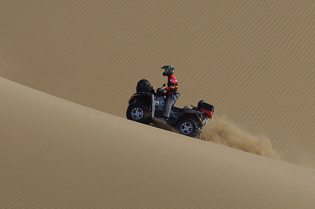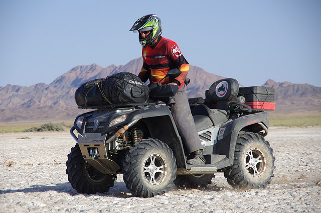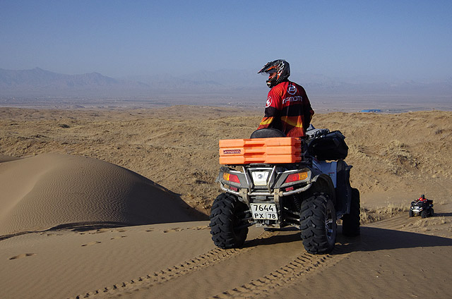 Интересный водительский опыт принес переход через пустыню Деште Кевир. В этих условиях для квадроциклиста, как для пилота самолета, важны два фактора: высота и скорость. Только смысл у них несколько иной. На песчаных холмах надо всегда стремиться забраться на самый высокий из них, даже если он расположен не совсем в том направлении, в котором Вы желаете ехать. Секрет прост: с высоты лучше просматривается пространство и можно более точно наметить дальнейшую траекторию. А скорость позволяет не увязнуть в песке. Если разогнаться больше 40 км/ч, по песку можно ехать так же легко, как по укатанной грунтовке.