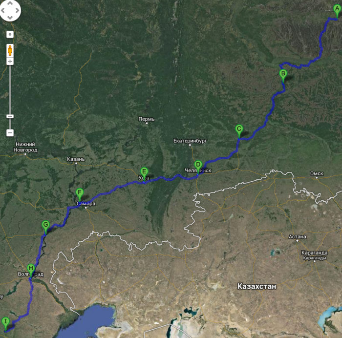 2. Ноябрьск (А) — Горноправдинск (B) — Тюмень (С) — Челябинск (D) — Уфа (E) — Тольятти (F) — Саратов (G) — Волгоград (H) — Ставрополь (I) [3870км]