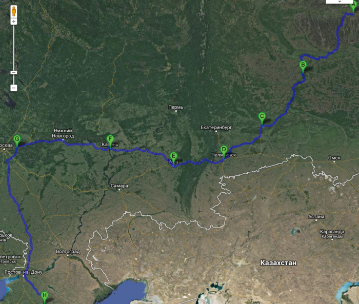 1. Ноябрьск (А) — Горноправдинск (B) — Тюмень (С) — Челябинск (D) — Уфа (E) — Казань (F) — Орехово-Зуево (G) — Ставрополь (H) [4715км]