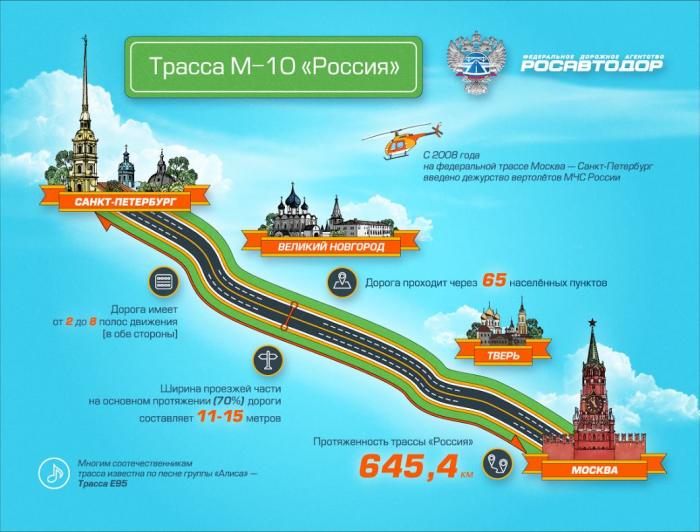 Новая дорога Москва – Санкт-Петербург в основном пройдет параллельно существующей автомобильной дороге М-10 «Россия» и будет пересекать ее на км 58, км 149, км 208, км 258, км 334, км 543 с устройством транспортных развязок в разных уровнях. Это позволит переключать движение транспортных потоков с М-10 «Россия» на скоростную автомагистраль и наоборот.
