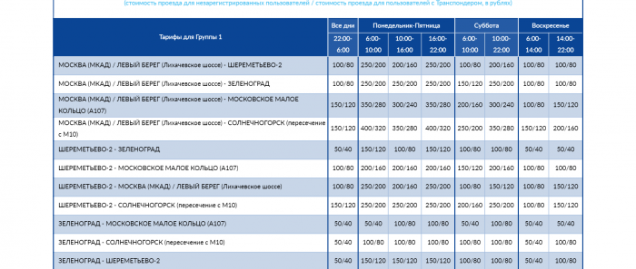 Тарифы на проезд по участку от МКАД до Солнечногорска автомобильной дороги М11 «Москва–Санкт-Петербург» с 15-го по 58-й км