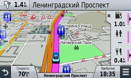 Поиск по маршруту претерпел некоторые важные изменения. Двигаясь к пункту назначения, вы можете вывести на экран, например, кафе или АЗС. Не нужно опять залезать в меню и искать там нужный раздел точек интереса. Просто выведите необходимое вам и не отвлекайтесь от дороги – навигатор сам подскажет, где находится нужный вам объект.