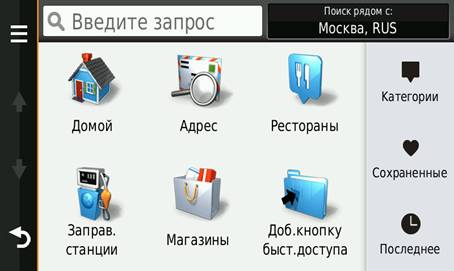 Далее, после нажатия на кнопку «Куда?», вы выходите в основное меню прибора и, главное, вы видите строку интеллектуального поиска. Нет надобности вспоминать точное название улицы, просто начинайте писать и навигатор сам подскажет что именно вы ищете – будь это адрес дома, бар или магазин рыболовных принадлежностей. Пара секунд и вы получите готовый маршрут к пункту назначения. Просто, удобно, надежно.