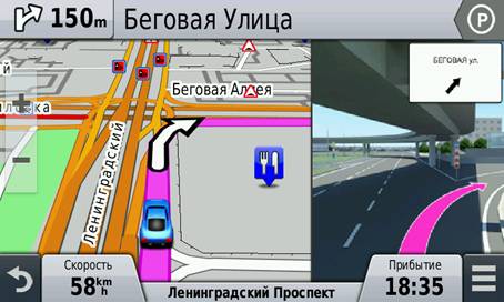 Для этого, Garmin очень удачно предусмотрел так модное нынче 3D. Но речь идет не о синих человечках, а о трехмерных изображениях сложных дорожных развязок и эстакад фотографического качества. Не спеша двигаясь в пункт назначения по заранее выбранному маршруту, вы, подъезжая к эстакаде, не будете вспоминать, куда именно надо ехать – в первый поворот или во второй. Вы увидите на экране вашего навигатора так называемый «сдвоенный» экран, на левой стороне которого будет показываться ваш текущий маршрут на карте, а вот справа вы увидите во всей красе творение наших неизвестных архитекторов-проектировщиков и, не смотря на все усилия дорожников, повернете именно туда, куда нужно.