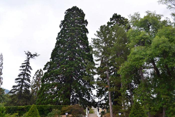 Секвойядендрон гигантский (мамонтово дерево): одно из высочайших деревьев на планете. На родине в Калифорнии живут деревья 2500-4000 лет, высотой до 100 метров и более 10 метров в диаметре. Имеет неприятное свойство притягивать к себе молнии: в НБС мамонтовы деревья все с отметинами. В так поразивших нас огромных деревьях у Массандровского дворца экскурсовод опознала именно секвойядендроны гигантские: