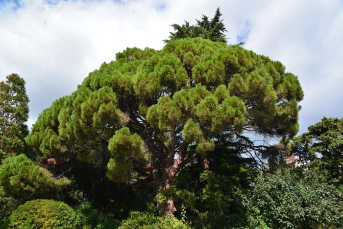 Пиния, итальянская сосна: это название ясно указывает на сорт древесины, из которого папа Карло выстругал неугомонного мальчишку (в данном случае Буратино не при чем – имеем дело с первоисточником в виде Пиноккио). Хвоинки у пинии – до 15 сантиметров длиной, шишки – 10-15 сантиметров. Орешки пинии напоминают кедровые по вкусу, но размеры у них – 2 сантиметра. Как написано на сайте НБС, их любимица-пиния растет в саду с 1814 года, в Крым она прибыла со своей родины – Италии. Нахождение под сенью этого дерева снимает приступы бронхиальной астмы.