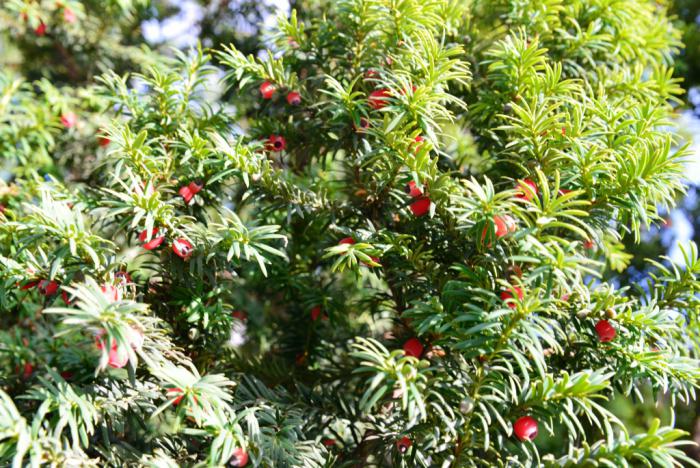 Тис ягодный: хвойное дерево с красивыми черно-красными семенами таит смертельную опасность. Все части дерева (кроме сочного красного присеменника) содержат алкалоид таксол. Что очень удобно в ряде случаев: оставил на ночь порцию вина в экологически безупречной деревянной чаше – наутро одним претендентом на престол или конкурентом меньше.
