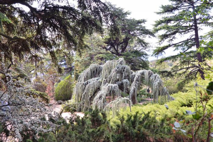 кедр атласский сизый плакучий. Пересадили его в НБС из Юсуповского парка. Дело в том, что после революции все плакучие формы деревьев были признаны упадническими и непролетарскими и подлежали уничтожению. Узнав о готовящемся варварстве в отношении с трудом полученного в XIX веке дерева (форма была получена путем прививки на типичный атласский кедр плакучей ветви, найденной на одном дереве в Атласских горах), сотрудники НБС переместили уникальный экземпляр из перешедшего в собственность народа Юсуповского парка в крымском Кореизе. Где он и продолжает изумлять посетителей.