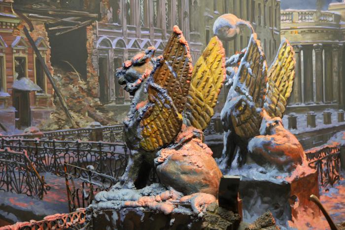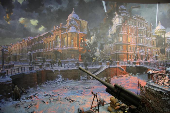 Живописец студии им. Грекова Евгений Алексеевич Корнеев сумел придать своей композиции наиболее яркое и чувственное восприятие постановочной сцены. Использование новейших методов декоративной росписи придало диораме реалистичный вид. В основу его замысла лёг образ города-героя, жители которого оставались стойкими и мужественными в долгие дни полной блокады, получая в день по 150 грамм хлеба. Окружённый в конце августа 1941-го, Ленинград выстоял. 27 января 1944 года небо над городом раскрасил праздничный салют.