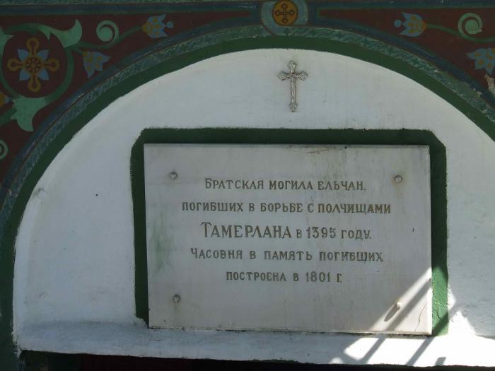 На территории собора есть часовня над могилой защитников города, павших в боях с Тамерланом. Елец- город древний, упоминается в летописях начиная с 1147 года. За свою историю несколько раз сжигался-разрушался или сам сгорал – и возрождался вновь. Вехи его побед есть на барельефах памятника «Город воинской славы» напротив Вознесенского собора.