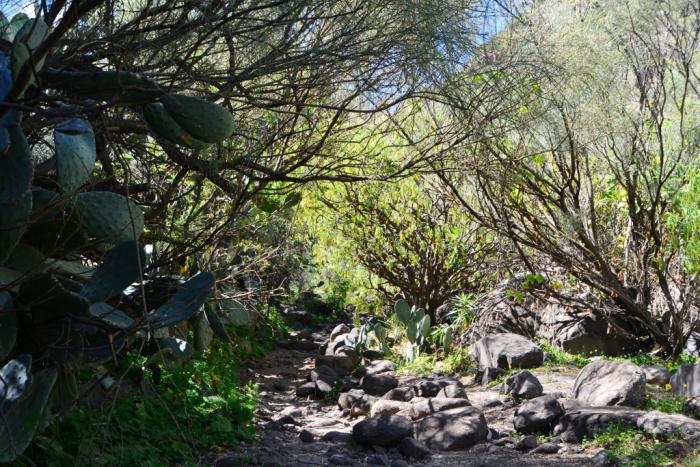 Нам в очередной раз помогают оффлайн-карты, потому что, несмотря на кажущуюся однозначность маршрута, есть несколько мест, где вообще непонятно, по какому склону идти. Маркировка тропы практически отсутствует. Я бы так охарактеризовала: в Barranco de los Cernicalos есть истинная тропа — и несколько ложных ответвлений. Причем последние выглядят крайне ненадежно и вот как раз туда соваться без инструктора, без подготовки и без снаряжения явно опрометчиво. Да и на основной тропе было два или три места, где карабкаться приходилось, цепляясь за корни и выступы камней, а спускаться – буквально на пятой точке.