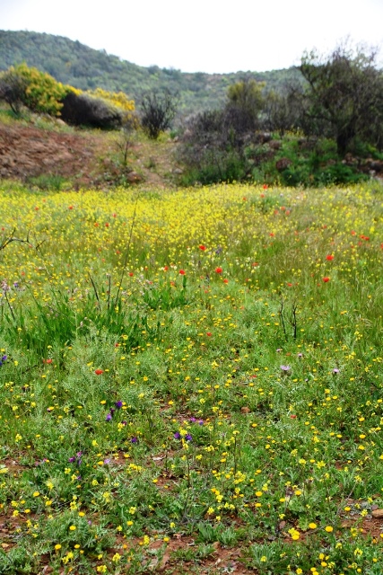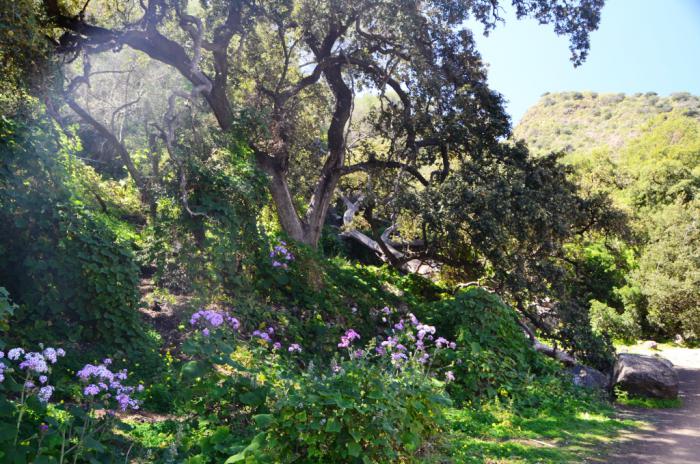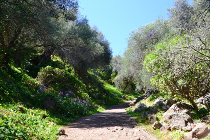 Зато спустя несколько минут после старта тропа выкатывается на пространство между деревьями с очень живописной кроной – я бы их обозвала оливами, но вряд ли: они до такого размера должны пару тысяч лет расти.
