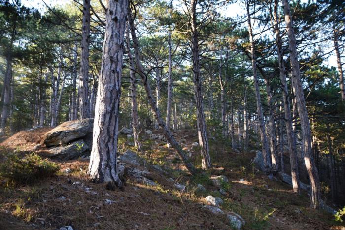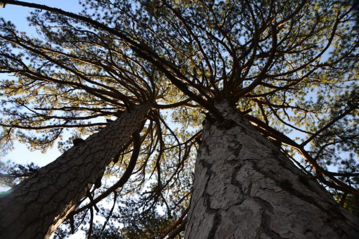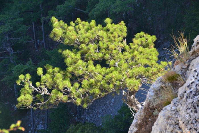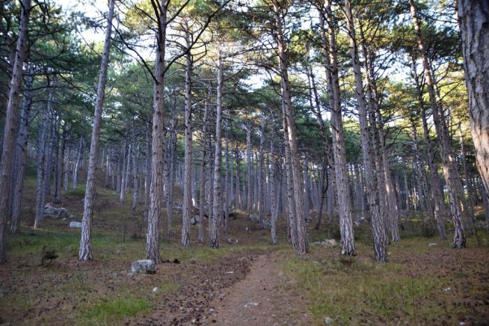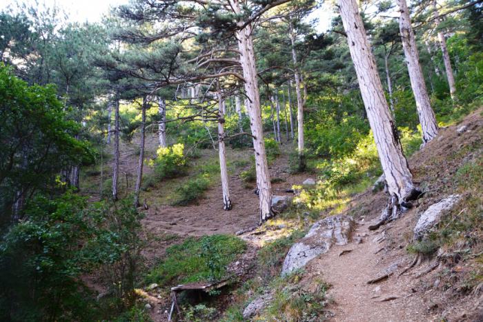 Спустя полчаса спуска на полусогнутых тропа несколько поутратила свой крутой нрав. На смену низкорослым деревьям пришли высокие мощные сосны: