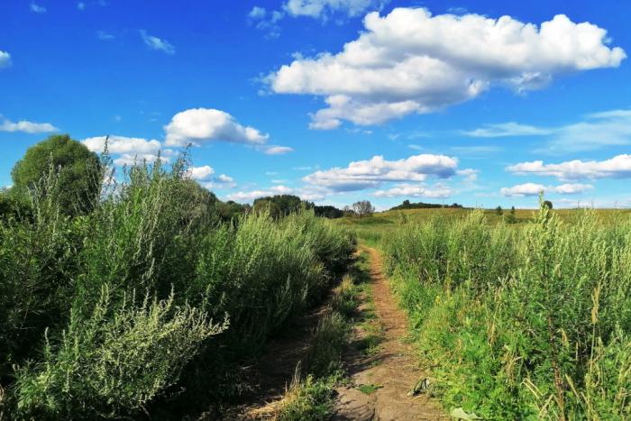 Добраться до стрелки можно по вполне проезжей грунтовой дороге вдоль полей, если только не бояться стен вплотную подступающего татарника.